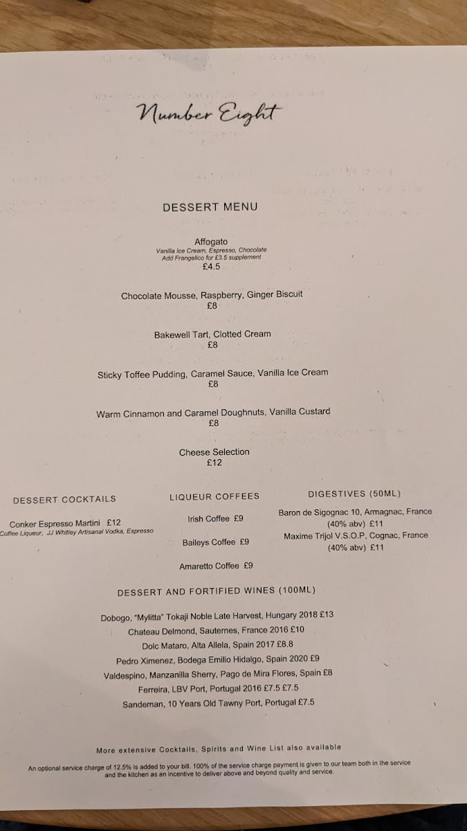 Step inside, and you'll be greeted by friendly staff who are eager to guide you through a menu that's a labor of love. The chefs at Number Eight take pride in crafting dishes that celebrate both traditional flavors and creative flair. The mains are particularly noteworthy, featuring a Triple Roast of Pork, Beef, and Chicken for only £28. Other standout dishes include the Roast Rump Of Aged Chart Farm Beef for £24, and a delightful Pumpkin & Ricotta Ravioli served with Sage Butter and Kale for an affordable £18.